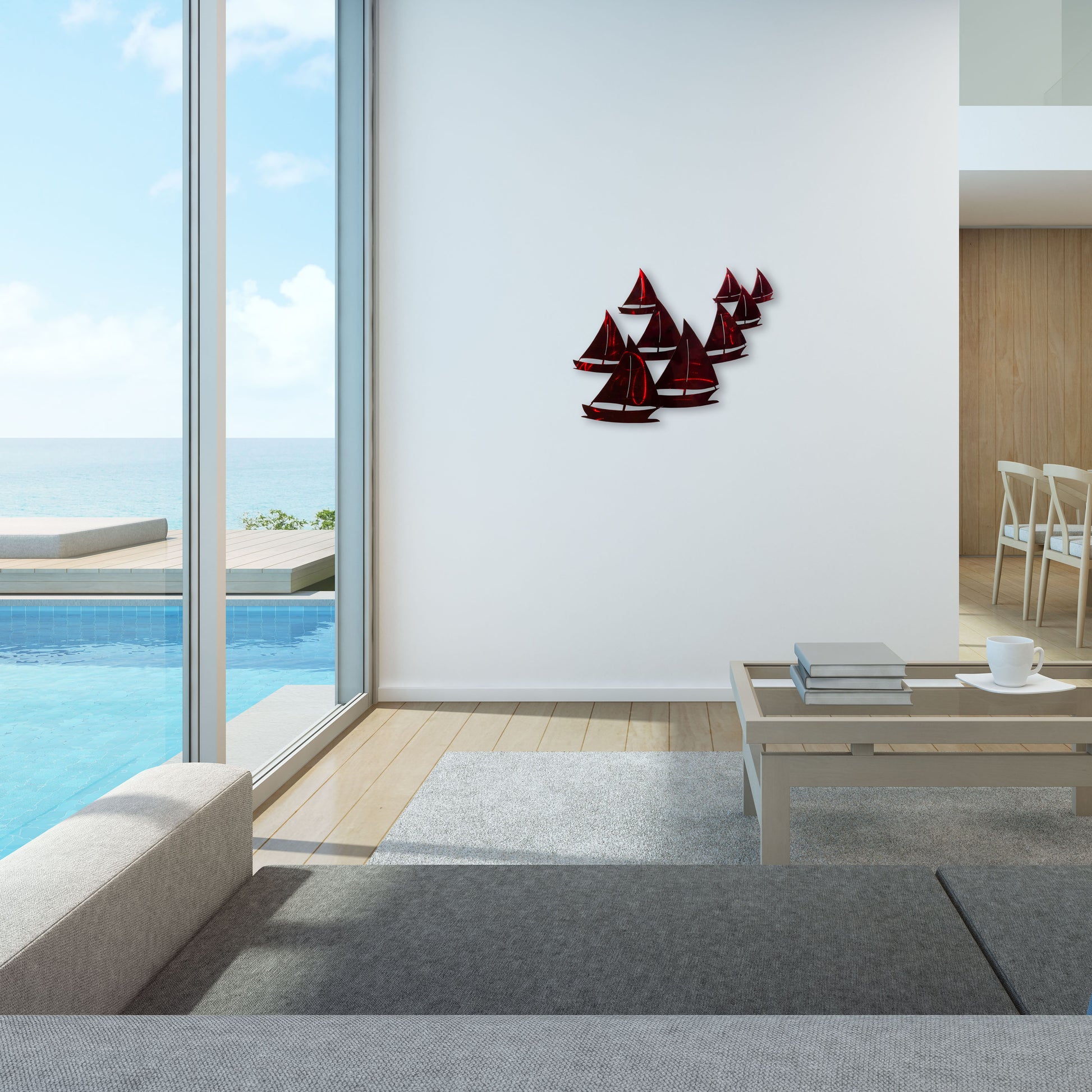 Adorn your space with "Fleet," a captivating assembly of sailboat silhouettes that bring the essence of the sea right into your home or office. This wall art sculpture is a collection of sail boats, each artfully curved to add a sense of movement and depth, as if they are gracefully sailing across your wall - then attached to its neighboring boat silhouettes to form a beautiful silhouette scene. The deep blue hue mirrors the ocean's vast beauty, while an option in vibrant red offers a striking contrast, catering to different tastes and interior color schemes.