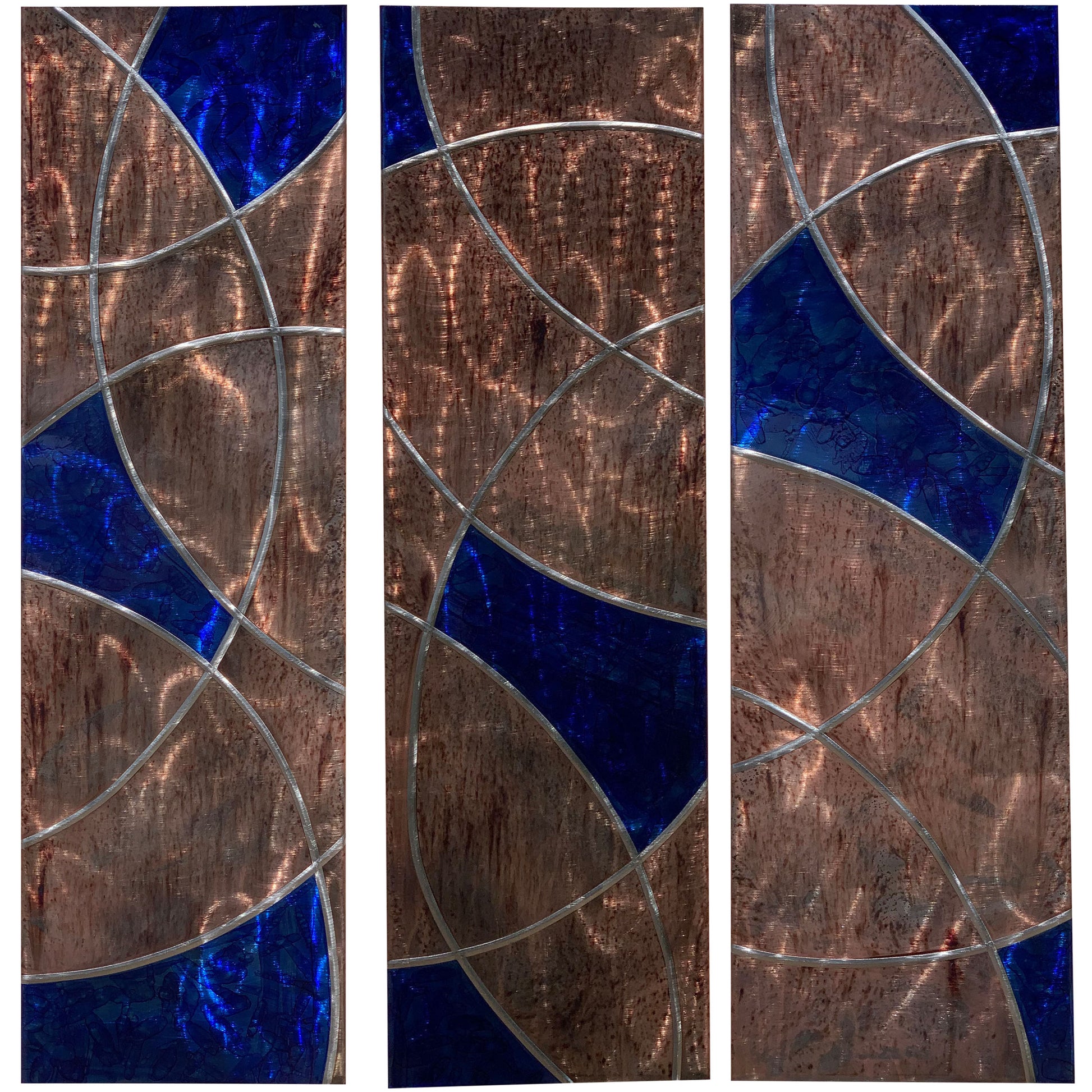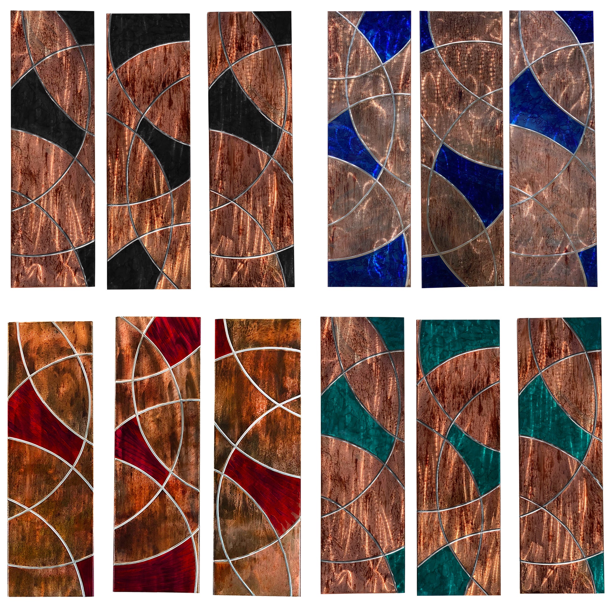 Introducing the "Abstract Arcs Planks" three-panel metal wall art, a triptych that captures the essence of contemporary elegance. This sophisticated wall feature, each panel measuring 9 inches by 30 inches, is a symphony of textures and hues, masterfully crafted from durable steel with a signature distressed copper finish. The artwork is accented with raised silver arc lines, carving out geometric shapes that are then filled with bold colors, available in a palette of options to complement your existing decor.