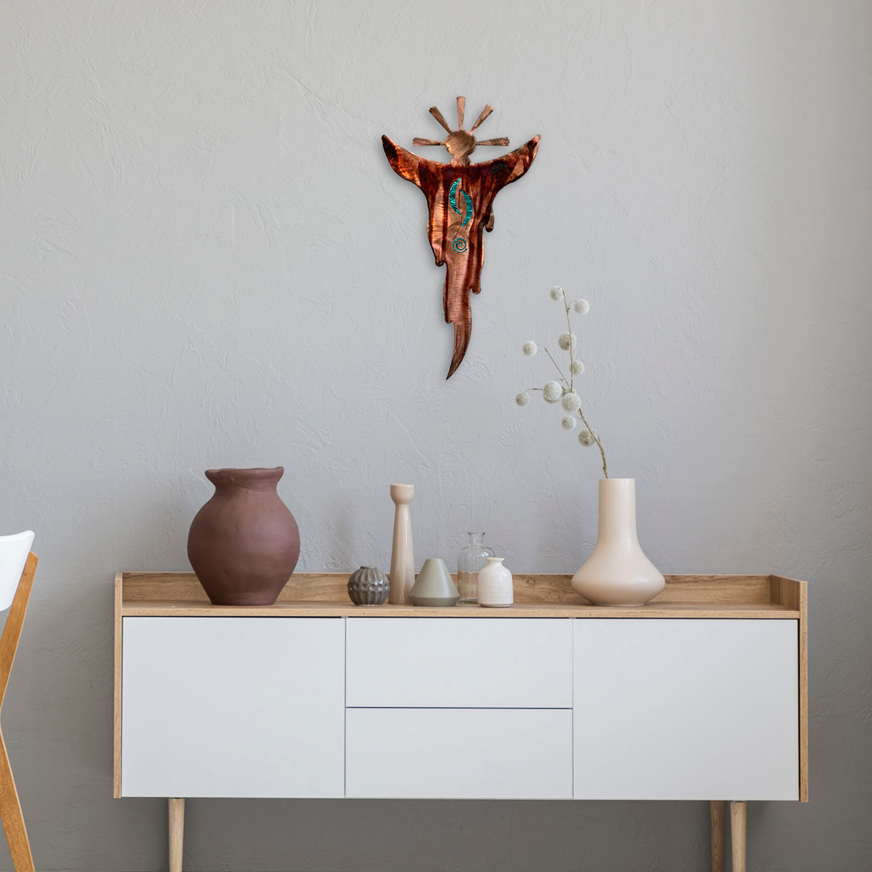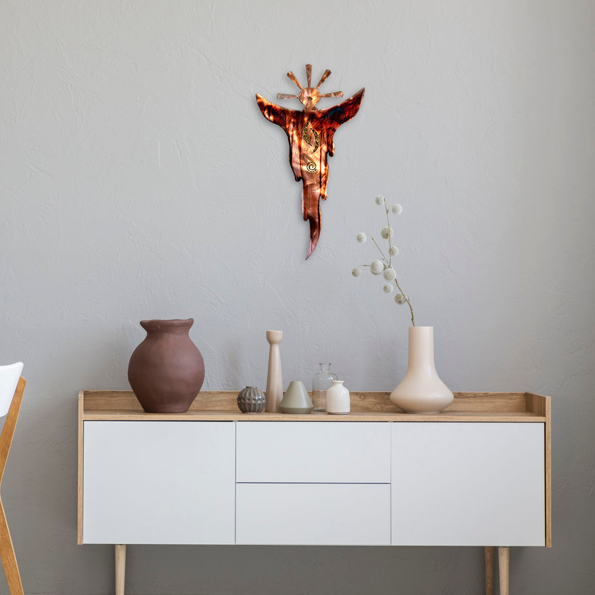 The "Smoke Spirit" showcases an intricate silhouette that seems to emerge and dissipate, much like the ethereal nature of smoke. The shimmering coppery hue of the metal captures the warmth of ancient hearths, where stories and legends were passed down through generations.