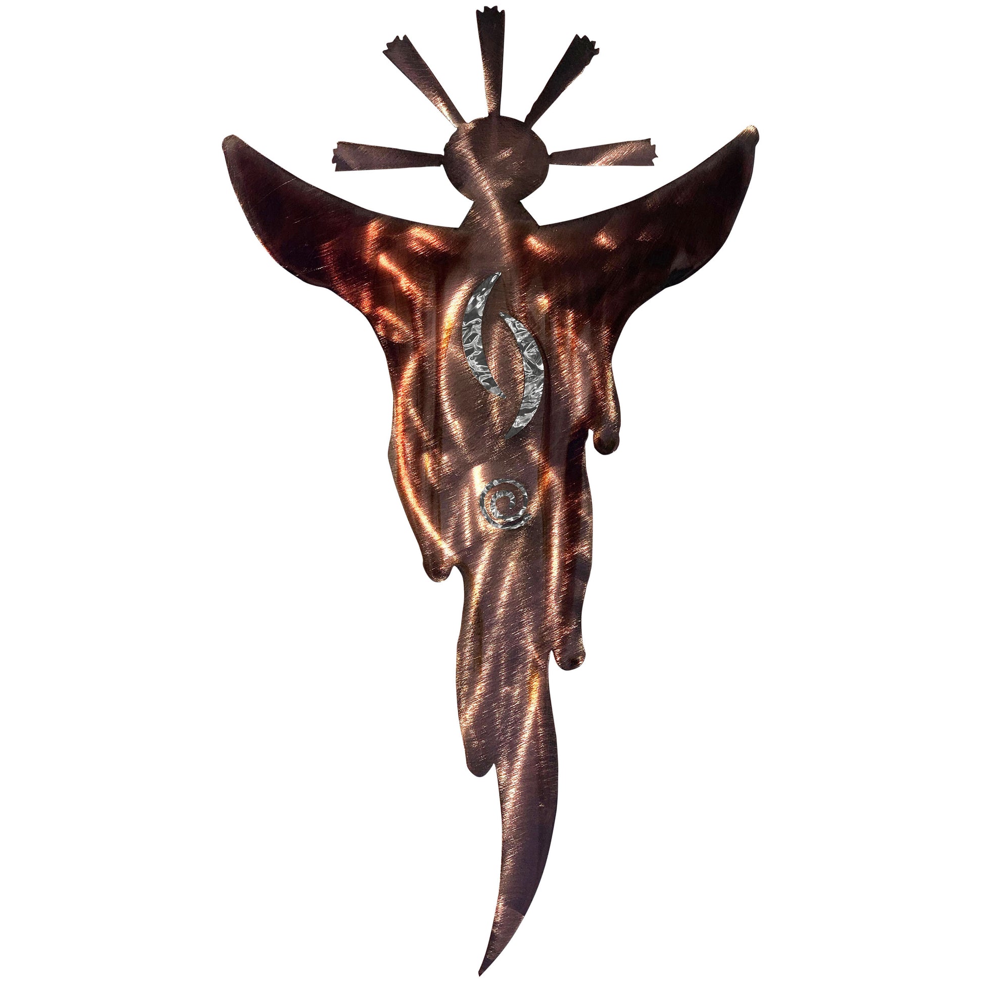 Atop the spirit figure stands a radiant sunburst, symbolizing life, energy, and the divine powers that oversee the world. Embedded within the silhouette are colorful foil motifs, which add contrasting touch to the warm metal. The elongated, dagger-like form at the bottom evokes a sense of grounding, tying the spirit to the earth, even as it seems to float in the ether.
