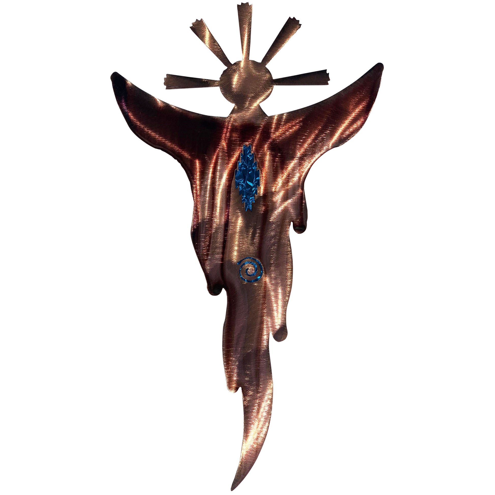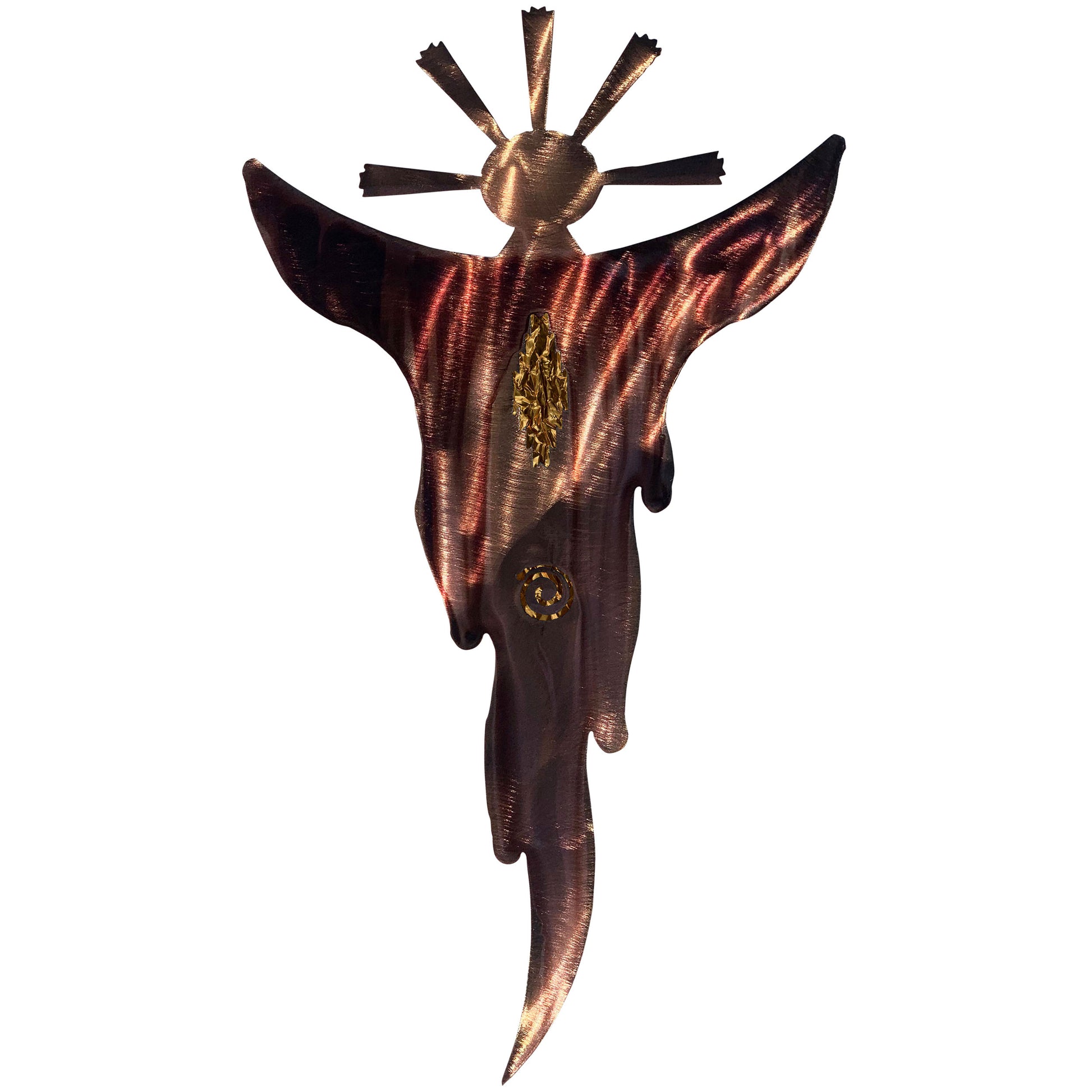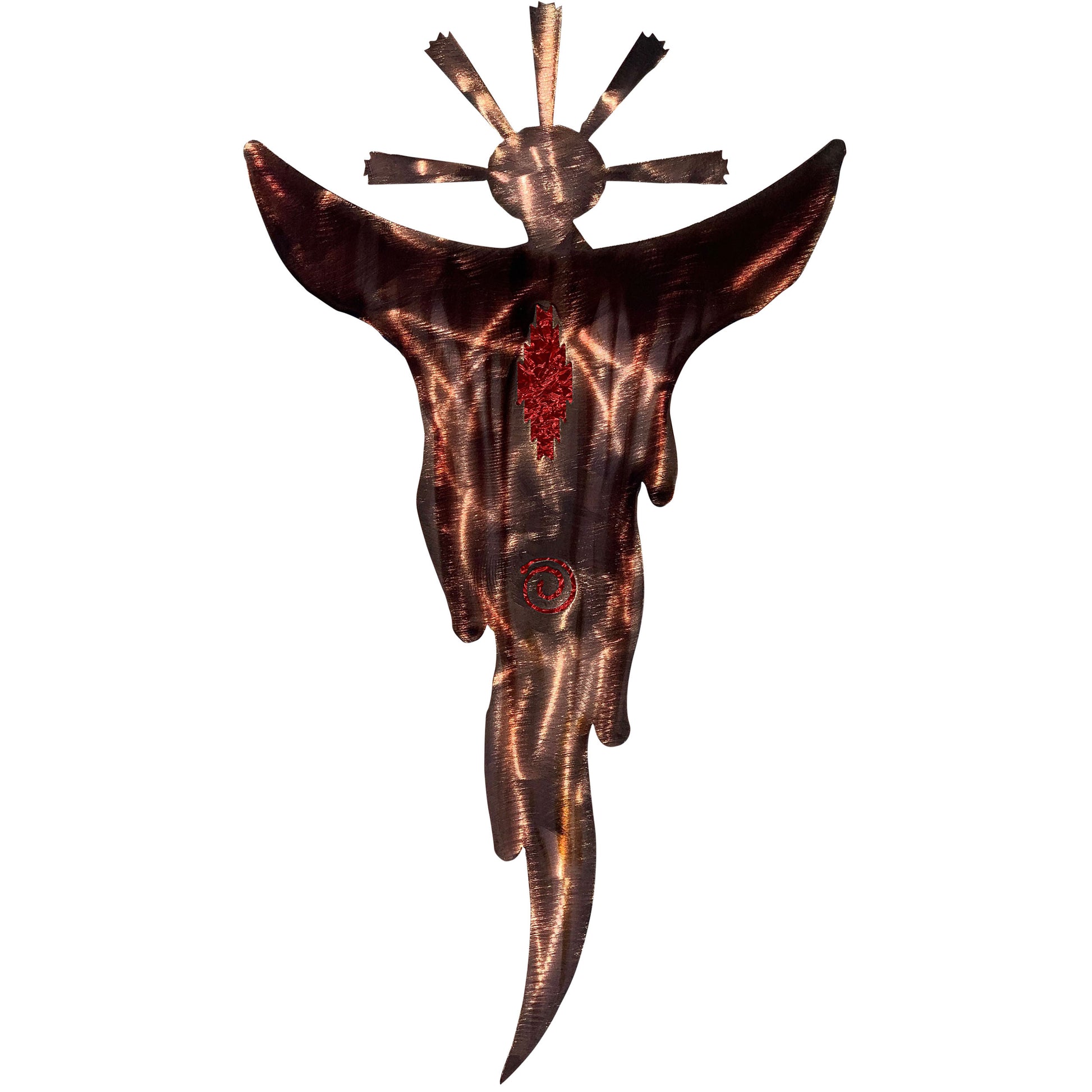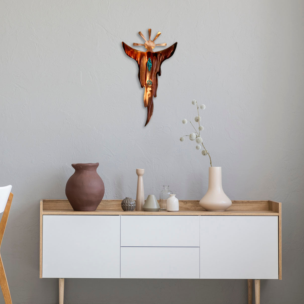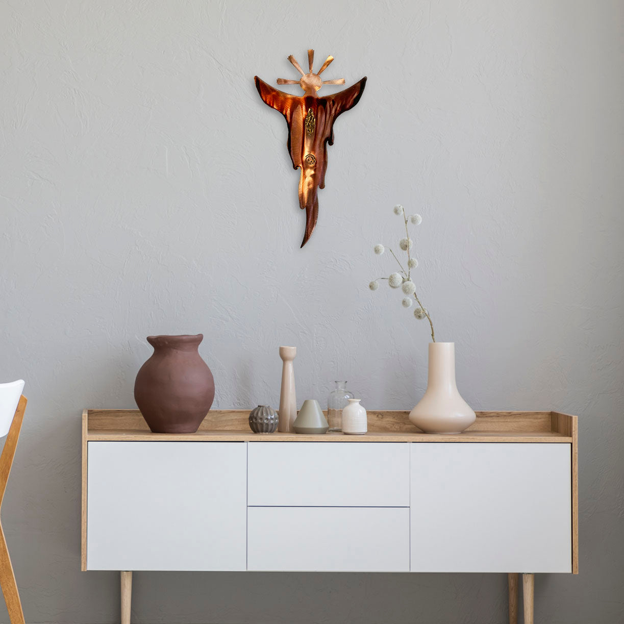 Atop the spirit figure stands a radiant sunburst, symbolizing life, energy, and the divine powers that oversee the world. Embedded within the silhouette are colorful foil motifs, which add contrasting touch to the warm metal. The elongated, dagger-like form at the bottom evokes a sense of grounding, tying the spirit to the earth, even as it seems to float in the ether.