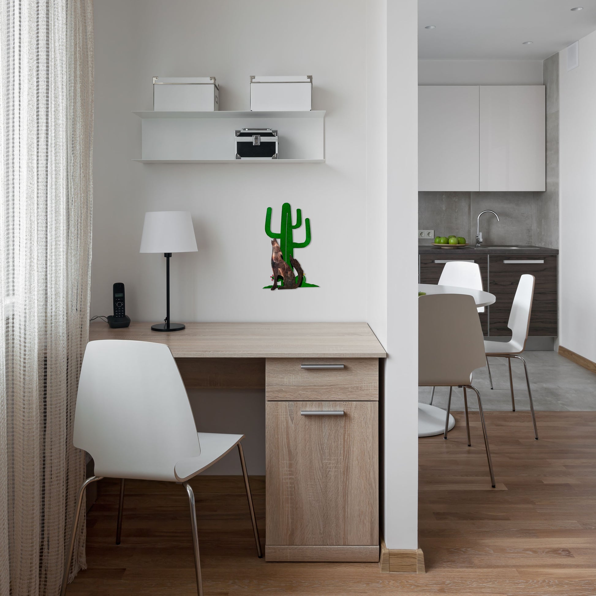 - Verdant Cactus: Vibrant green cacti rise majestically behind the coyote, crafted with attention to detail, reflecting the cactus's stature as the silent sentinel of the desert.