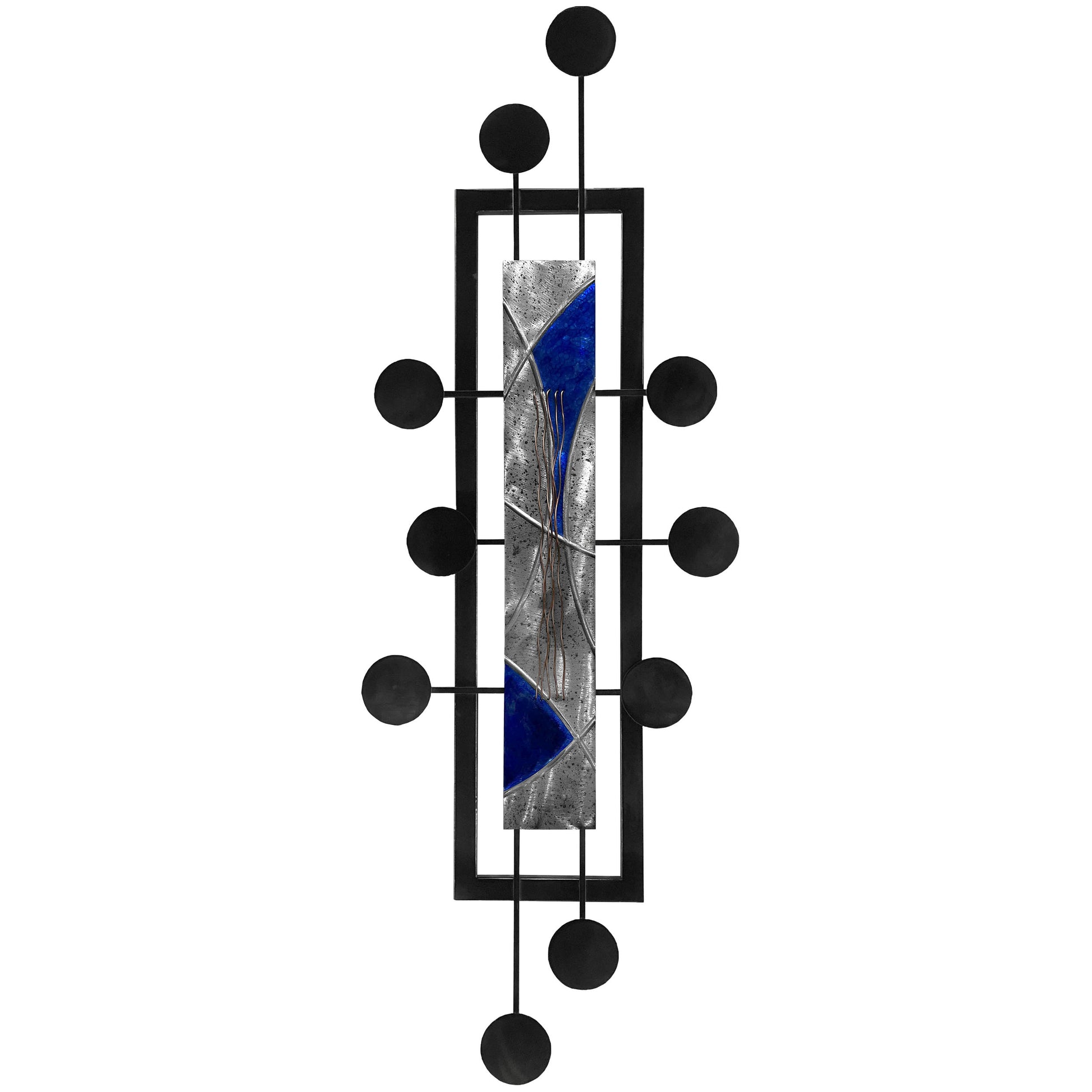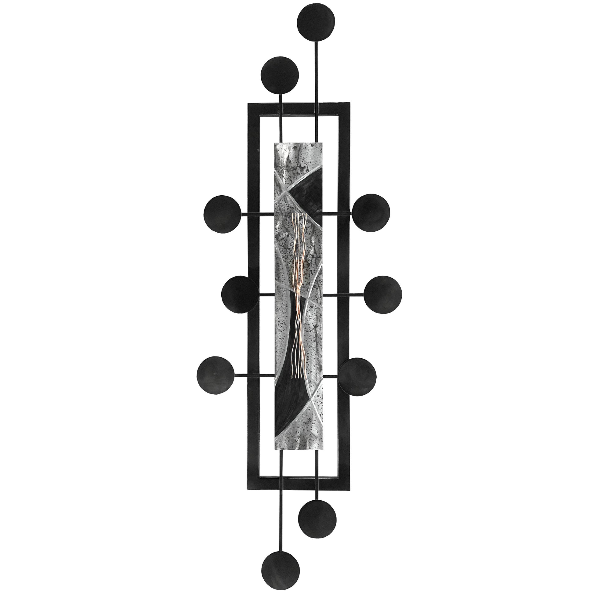 At the heart of this artwork lies a beautifully rendered panel, boasting rich shades of silver and deep red. The intricate swirls and patterns on the inlay invoke a sense of movement, contrasting sharply with the rigid black framework that encompasses it. The art is further accentuated with symmetrically arranged black orbs, adding depth and dimension to its overall composition.