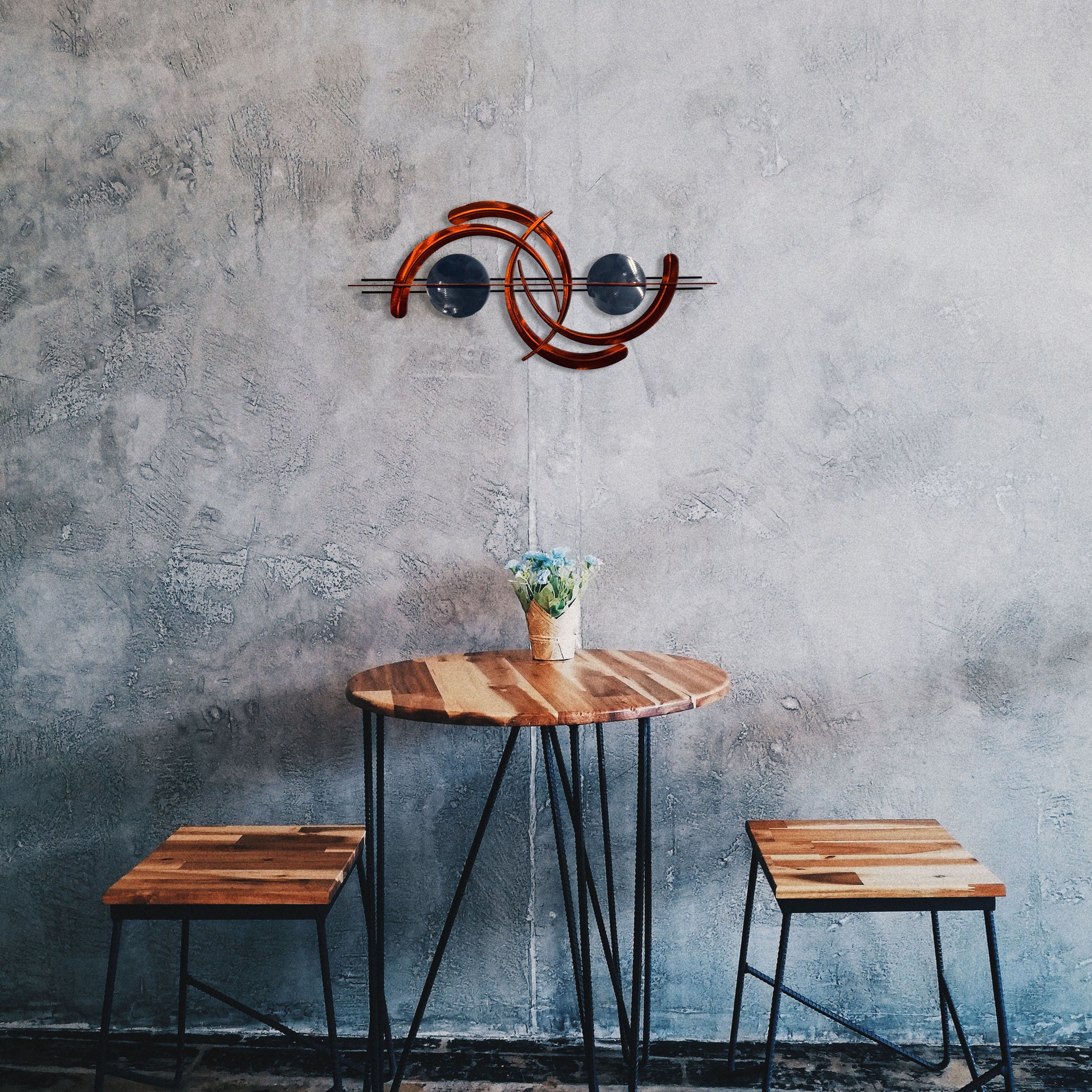 Immerse yourself in the celestial beauty of the "Sun Dogs" metal wall sculpture, a piece inspired by the natural wonder of parhelia where bright spots grace the sky alongside the sun. This 29.25 inches by 13.5 inches artwork captures the essence of this phenomenon with its vibrant candy orange hues and polished silver steel discs that mimic the halo effect.