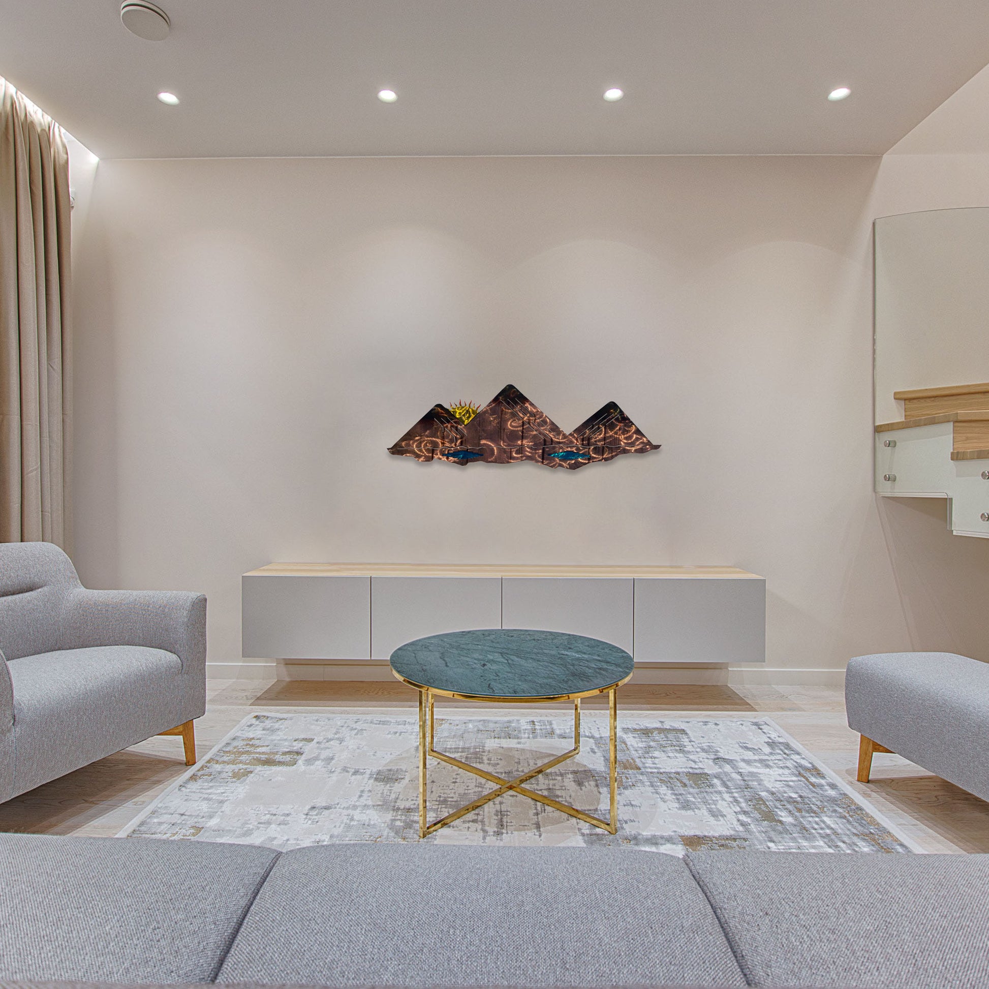 The Sunset Hills Metal Artwork is a beautiful, scenic metal display featuring distant hills, a yellow sun setting behind them, and a watery foreground accented with blue tones. The contrasting color scheme is what makes it so eye-catching and attractive, the sun and water emerging beautifully from the primary copper color of the hills.
