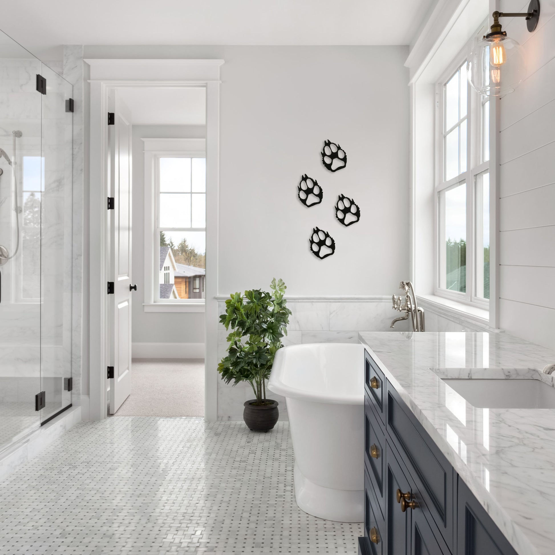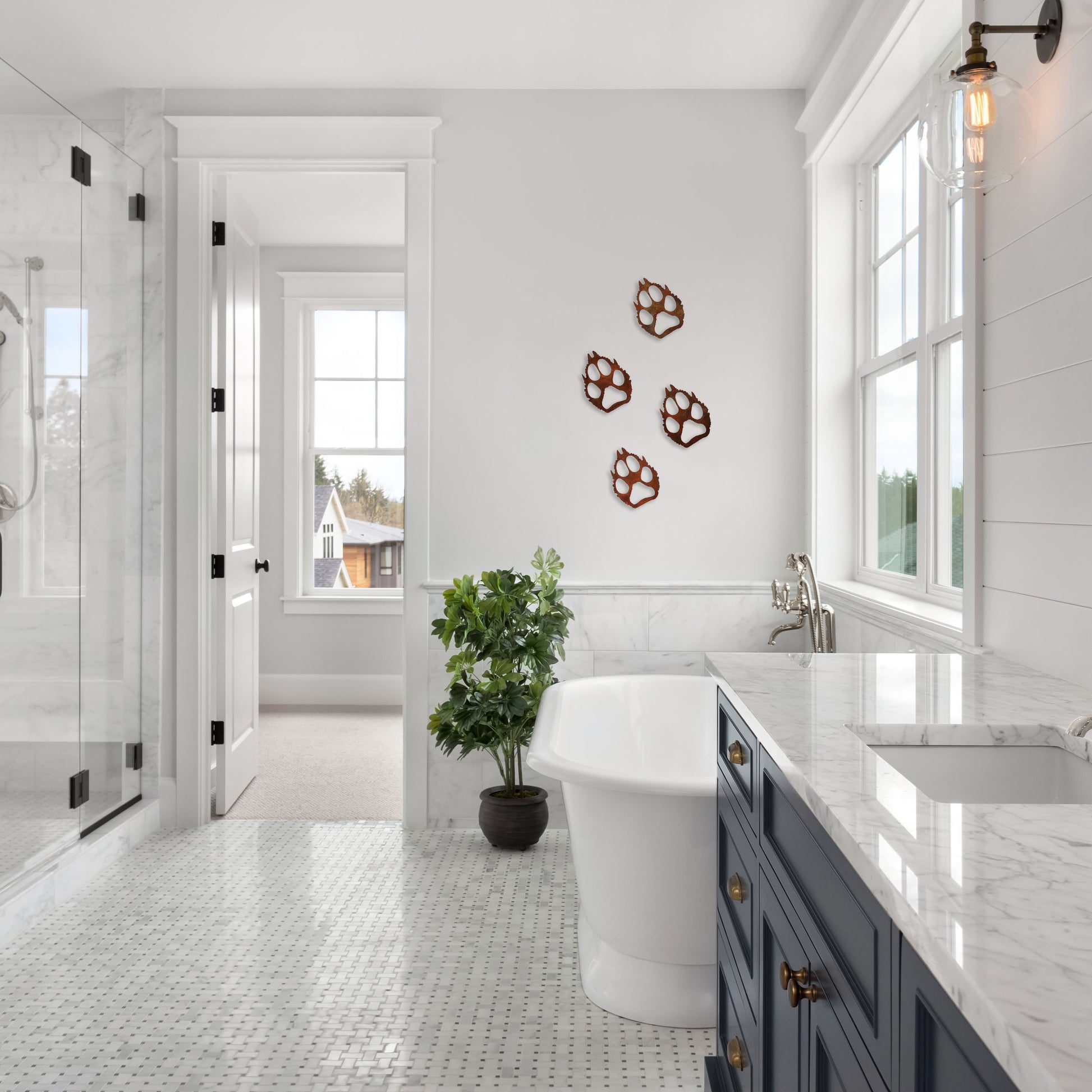 Whether mounted above a cozy fireplace, adorning a hallway, or accentuating the serenity of a spa-like bathroom, the "Wilderness Paw Prints" wold paw print set infuses your living space with a serene, earthy elegance. Choose your finish and transform your home into a sanctuary that celebrates the essence of the wild.